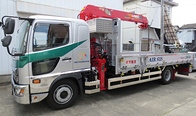 積載量6,100kgを可能にした8t仕様のエアサス・ユニック(クレーン)車。荷台寸法幅は約2.4mと広めで、大型車と同等の車両幅を確保しています。車両長は4t並みとコンパクトなため、首都圏のせまい路地にも対応できます。